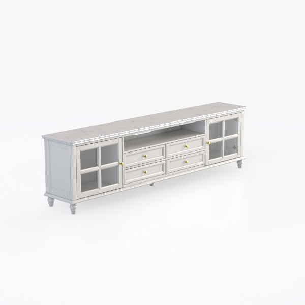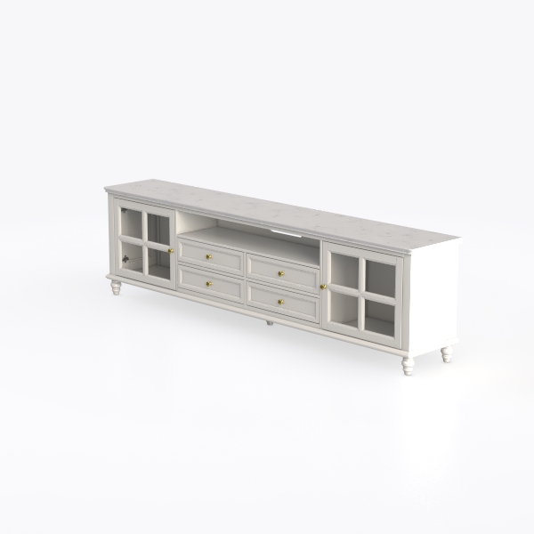 Transparent glass doors frame the sides, allowing glimpses of curated decor inside, while four sleek drawers with polished brass knobs offer understated functionality; the knobs, small and rounded, add a vintage-inspired charm that contrasts beautifully with the modern simplicity of the white panels. The legs, slender and tapered, lift the piece slightly, creating a sense of lightness that makes it feel spacious rather than heavy.