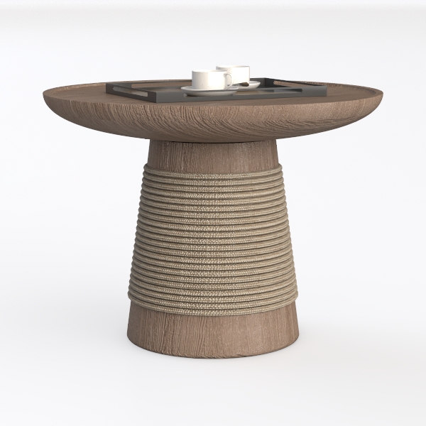 Visually, the table captivates with its warm, earthy palette—light oak tones for the tabletop and base, complemented by the subtle cream of the woven detailing. The tabletop, with its smooth, sanded surface and visible wood grain, feels cool and grounding to the touch, while the tightly coiled, textured material of the base adds a dynamic, almost sculptural contrast. Its rounded silhouette softens the space, making it feel open and inviting, with no sharp edges to disrupt the flow.