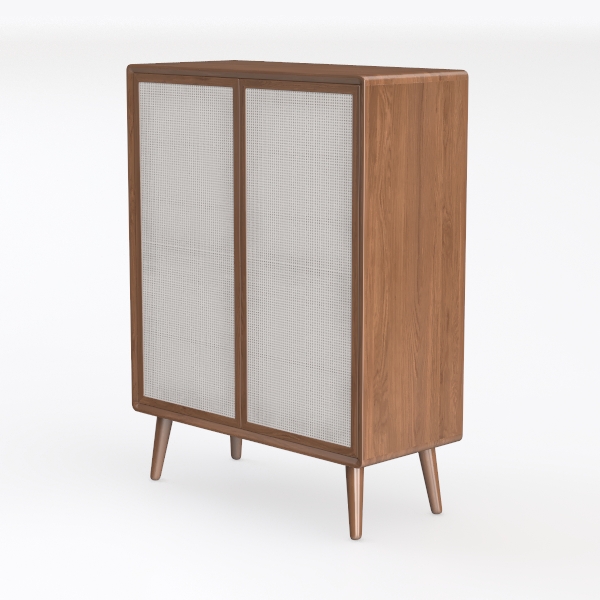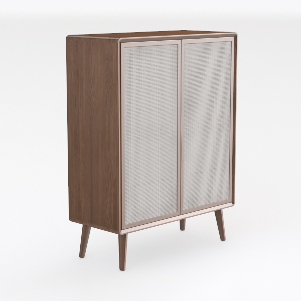 Crafted with a thoughtful fusion of natural materials and contemporary design, this piece draws inspiration from the interplay of traditional artisanal techniques and modern simplicity. The cabinet features a rich, warm-toned wooden frame with a smooth, slightly matte finish that feels invitingly cool to the touch, while the two large sliding doors, woven from an airy, open-textured material, add a light, breathable layer—their delicate weave catching and diffusing light to create soft, dynamic shadows across its surface. Visually, the contrast between the solid wood edges and the intricate webbing creates a balanced, organic look that feels both grounded and elegant.
