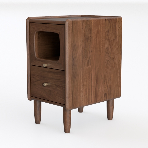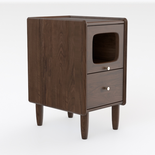 Inspired by mid-century modern design, this compact piece merges nostalgic warmth with understated utility, drawing from the era’s love for organic lines and natural materials. The rich, warm walnut wood grain takes center stage, its smooth, polished surface catching light to reveal subtle, flowing patterns that feel both tactile and inviting—running a hand over the edges, the texture is soft yet substantial, like a well-loved heirloom. The upper open compartment, framed by a gently curved border, evokes the charm of vintage screen designs, adding a playful retro twist, while the two lower drawers, fitted with small, brass-toned pull handles, offer practical storage for bedtime essentials, their dovetail joints hinting at sturdy craftsmanship. Supported by slender, tapering legs, the piece sits lightly, balancing stability with airiness, making it ideal for tight bedroom spaces. It pairs seamlessly with a low-profile bed in neutral linens, a ceramic lamp on the open shelf, and a woven rug, crafting a cozy, timeless retreat. Whether in a minimalist Scandinavian-inspired room or a warm, mid-century modern setting, its blend of functionality and curated character ensures it becomes both a practical companion and a design focal point.