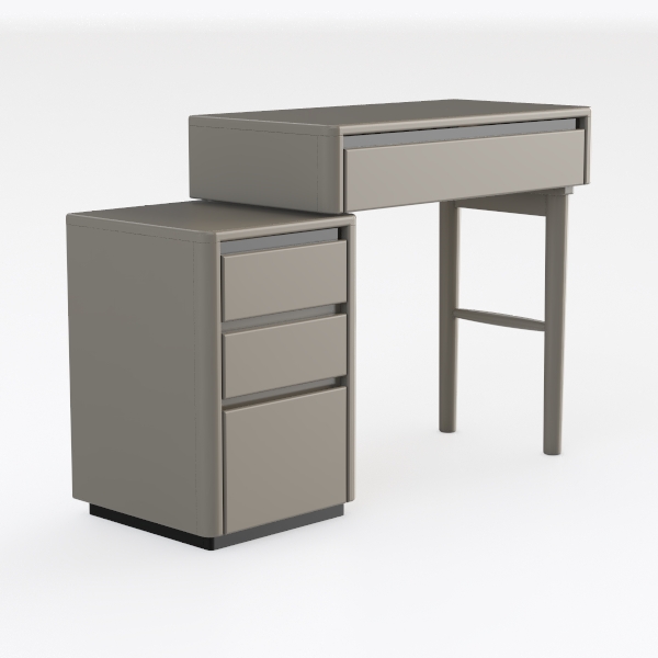This elegant piece draws inspiration from the essence of modern minimalism, where every curve and line serves both functional and aesthetic purposes. Crafted with a soft taupe finish that exudes warmth, its matte surface balances smoothness with subtle texture—like the gentle glow of natural stone, it feels grounded yet refined to the touch. The clean, unadorned design features a wide, flat top for workspace or dressing, paired with a compact three-drawer unit beside it, each drawer sliding open with a quiet, satisfying glide, revealing organized storage for stationery, jewelry, or small essentials. The slender, tapered legs add a lightness to the structure, keeping the piece visually airy even in smaller rooms, while the cohesive color palette—taupe, matte black, and soft wood undertones—blends seamlessly with both contemporary and Scandinavian-inspired decor. Whether placed in a cozy bedroom as a vanity or a minimalist home office, it merges practicality with understated luxury, proving that simplicity can be deeply sophisticated.