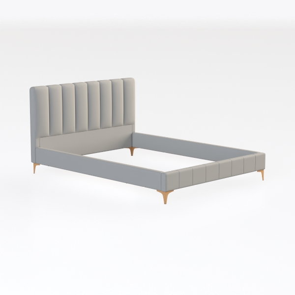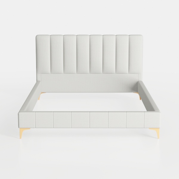 Inspired by timeless minimalism with subtle luxury, this bed features soft, vertically channeled upholstery in warm light gray, offering a smooth, comforting touch. Its elegant golden metal legs add refined opulence, perfect for modern-luxe bedrooms. Pair with sleek marble nightstands and a soft chandelier for a cohesive, sophisticated space. The structured design balances style and comfort, ensuring a restful retreat.