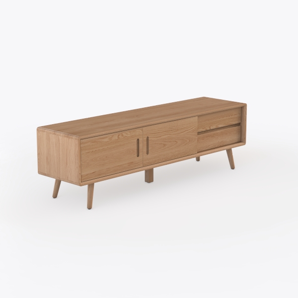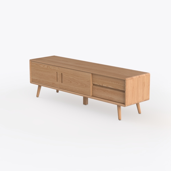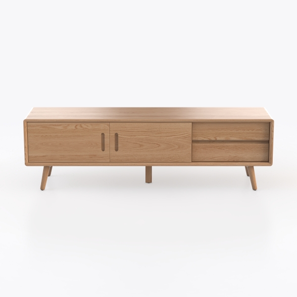 Designed to echo natural warmth, this piece blends organic textures with minimalist Scandinavian aesthetics. Its smooth oak surface, with subtle wood grain, offers a warm, tactile feel, softening the room’s edge. Ideal for a modern living room, it pairs beautifully with neutral sofas and potted greenery. Ample storage—two drawers and cabinets—keeps devices and essentials organized, while slender, tapering legs add lightness to the space.