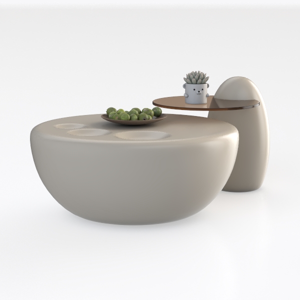 The main basin-like indentation in the tabletop provides a convenient spot for storing remote controls or coasters, balancing style with practicality. The attached, egg-shaped sidepiece offers extra surface space for snacks, drinks, or a small potted succulent, turning it into a versatile centerpiece that combines utility and aesthetic appeal.