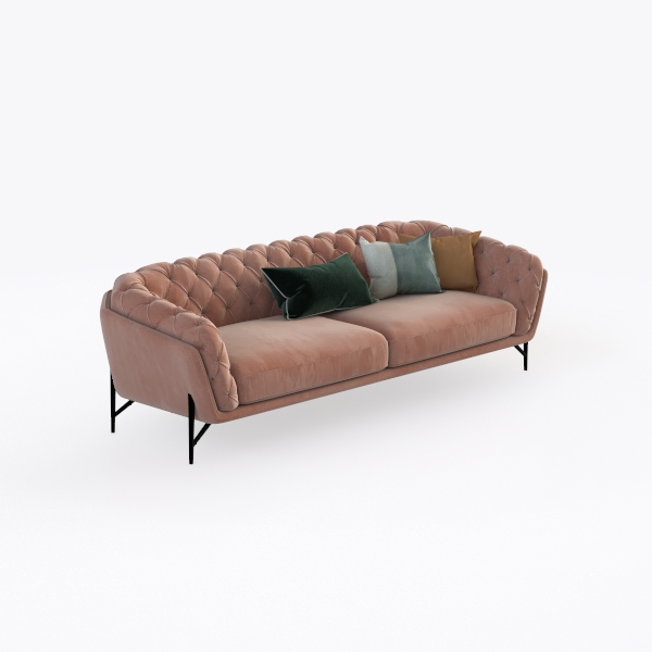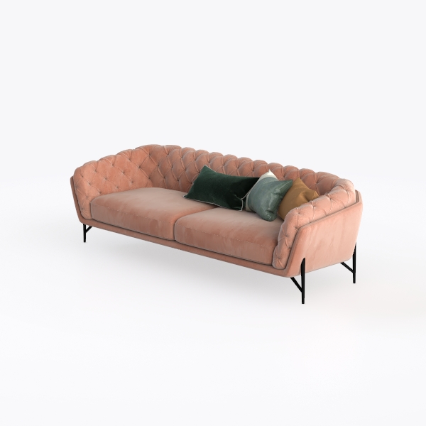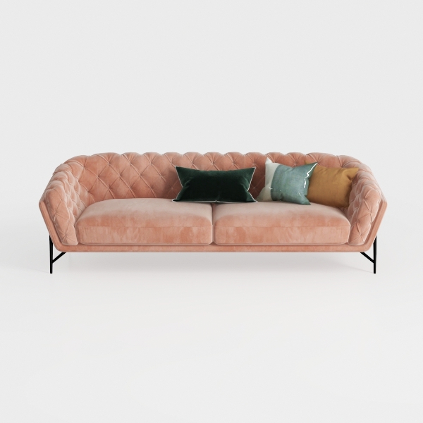 Crafted with a blend of mid-century charm and contemporary elegance, this sofa draws inspiration from 1950s retro upholstery, reimagined with a modern twist. Its soft, velvety blush-pink fabric, with a subtle diamond-quilted pattern, feels like a warm embrace—each square of the quilted design adding depth to the visual, while the fabric itself glides smoothly under the hand, promising comfort with every touch. The low-profile silhouette, balanced by sleek black metal legs, keeps the piece light and airy, making it a focal point without overwhelming the space.