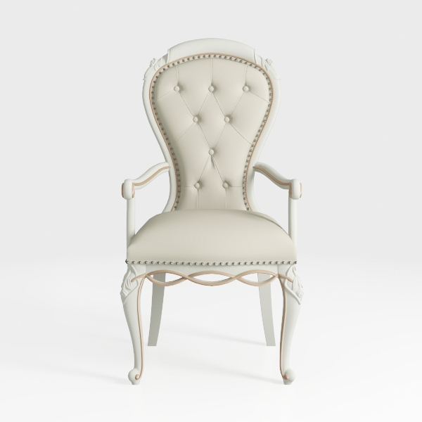 Design inspiration draws from 18th-century European aristocratic furniture, blending timeless elegance with refined details. Its smooth white upholstery, tufted with buttons, offers soft tactile feel, while carved wooden legs add intricate texture. Ideal for classical or neoclassical dining/living spaces, pair with solid wood tables and crystal chandeliers for sophistication. Wide seat and armrests ensure optimal comfort, making it both functional and decorative.