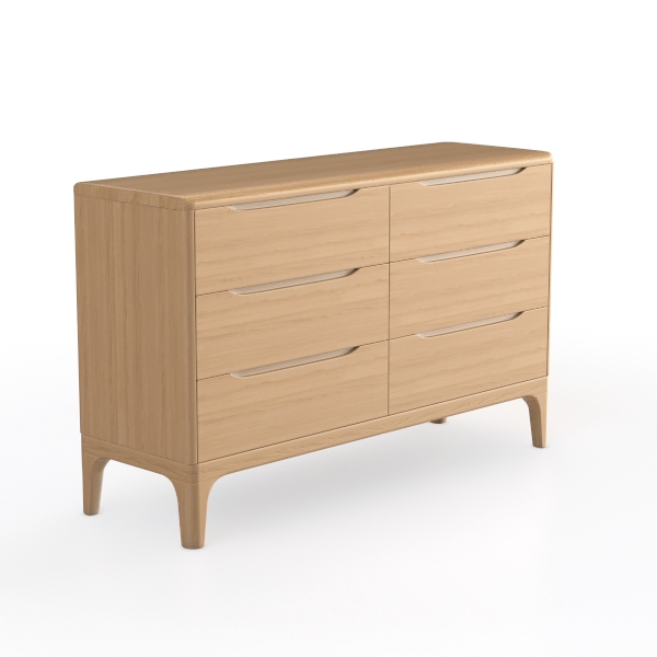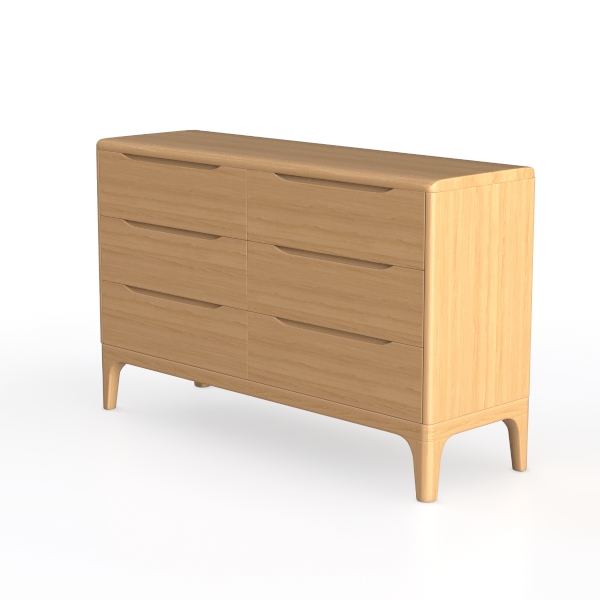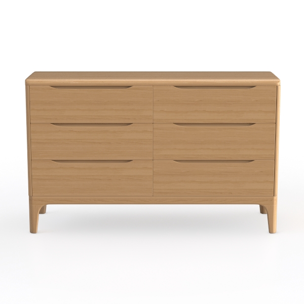 Inspired by Scandinavian minimalism, this wooden dresser features warm oak tones, smooth surfaces with visible wood grain, exuding natural tactile warmth. Ideal for modern minimal or Scandinavian-inspired living rooms, it complements marble accents or matte black metal fixtures. Six spacious drawers with smooth gliding mechanisms offer ample storage for linens or daily essentials.