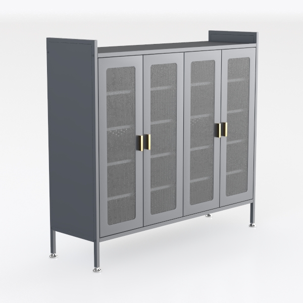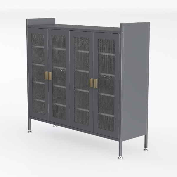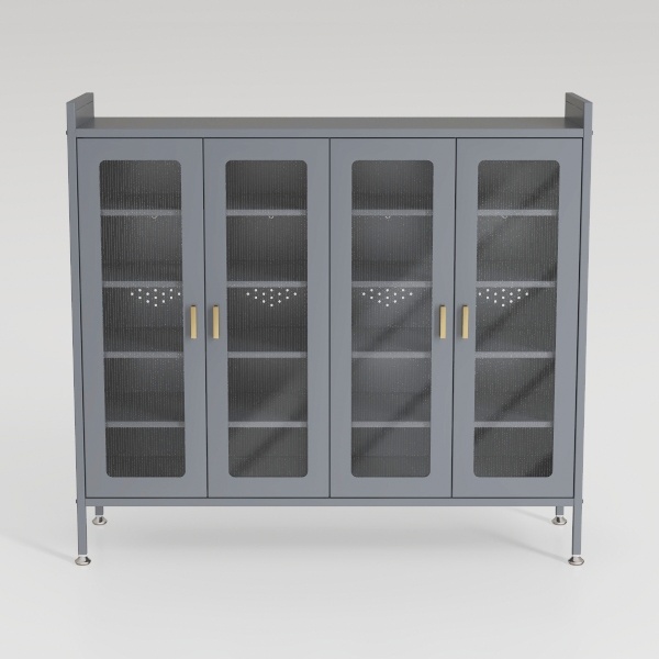Inspired by mid-century industrial minimalism, this piece blends sleek metal frames with delicate perforated glass doors. Its matte gray finish exudes calm, while the gold metal handles add a warm contrast, creating a balanced visual rhythm. Perfect for modern, Scandinavian, or luxury living rooms, dining areas, or home offices, pairing seamlessly with wooden shelves or marble accents. The four-panel glass doors showcase decor, while the slender metal legs elevate the piece, ensuring both storage and an airy aesthetic.