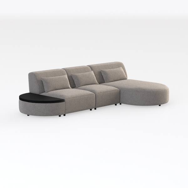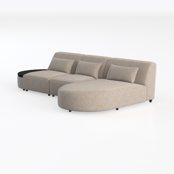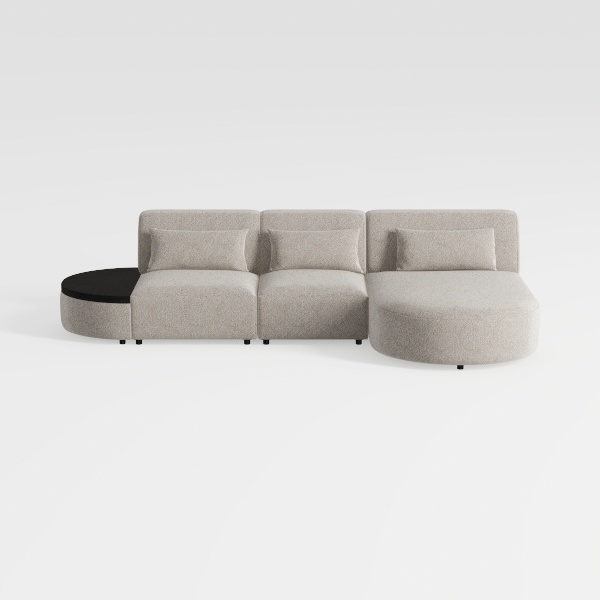 Inspired by organic curves and minimalist aesthetics, this sofa blends soft textured fabric with clean, flowing lines. Its warm neutral tones and plush, cloud-like surface offer a tactile and visual sense of calm. Perfect for modern living rooms, pair it with marble side tables and matte black lighting to enhance its sleek vibe. Deep, roomy seats and a compact, integrated ottoman provide exceptional comfort and versatile relaxation space.