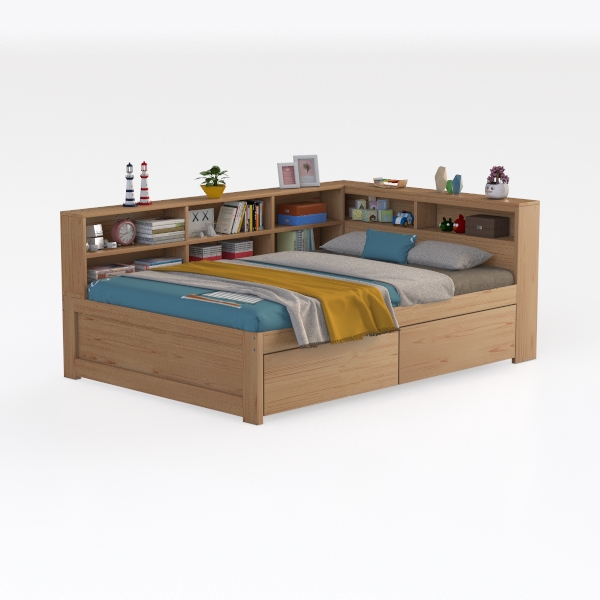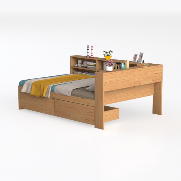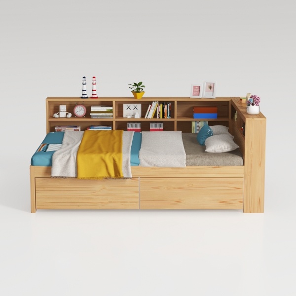Inspired by merging sleep and reading needs, this bed integrates a headboard bookshelf, blending practicality with warmth. Crafted from smooth, light wood, its clean lines create a natural, cozy vibe. Perfect for compact bedrooms, it suits minimalist or Scandinavian styles, paired with soft bed linens and potted plants. Under-bed drawers offer hidden storage, while the built-in shelf holds books and decor, making bedtime reading effortless and space-efficient.