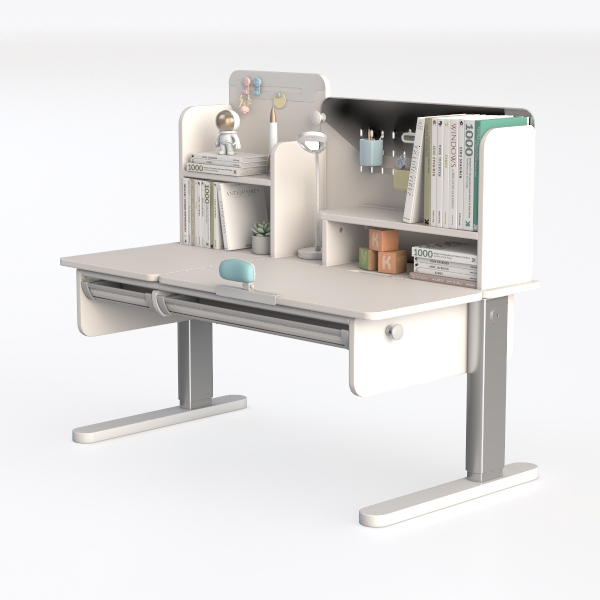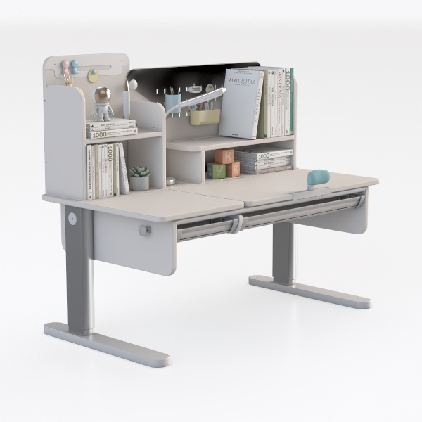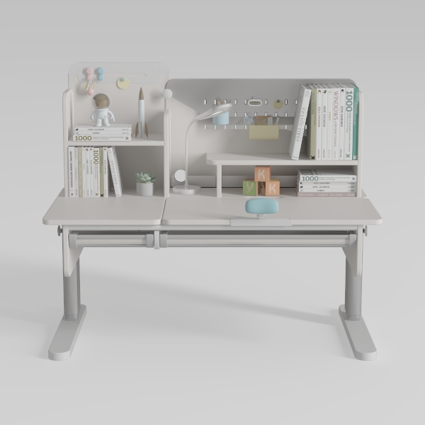Inspired by space exploration and childhood curiosity, this dual-section desk blends playful elements with practicality. Sleek white surfaces and matte metal legs create a clean, modern look, while smooth textures offer a comfortable touch. Perfect for a kid’s study nook or home office, it pairs beautifully with soft lighting and wooden accents for a warm, inviting vibe. Adjustable height grows with children, and built-in shelves/pegboards keep books, toys, and stationery organized neatly.