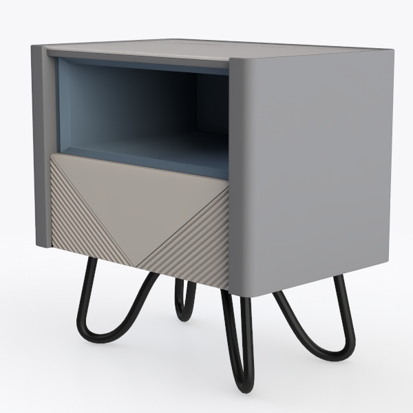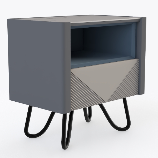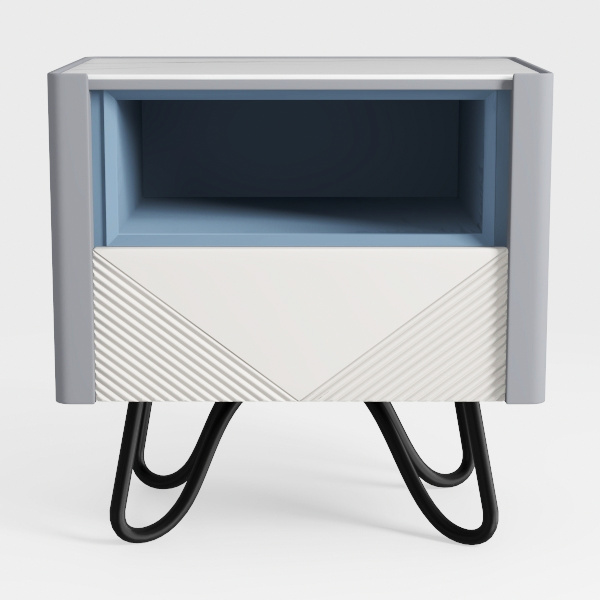 Inspired by geometric minimalism, merging sharp angles with soft color shifts, this nightstand features a matte gray frame, a white front with subtle ridged textures, and a deep blue interior. Its black, curved metal legs add sleek contrast, boosting the modern vibe. Perfect for a minimalist or Scandinavian bedroom, it pairs with soft textiles and warm lighting, offering a compact open shelf and a smooth drawer to keep essentials neat.