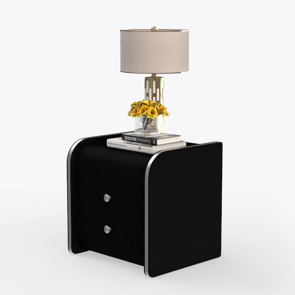 Inspired by mid-century modern design, this nightstand features sleek black matte surfaces with polished chrome accents, blending sophistication and minimalism. Its smooth texture and geometric lines create visual appeal, while the soft lamp glow and vibrant floral arrangement add warmth. Ideal for a contemporary bedroom, it pairs seamlessly with marble decor and linen textiles. Two functional drawers offer hidden storage, balancing style and practicality.