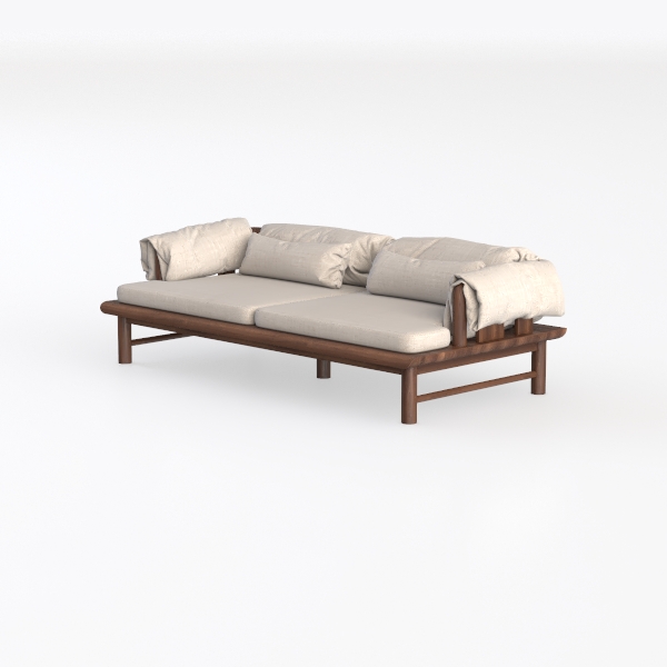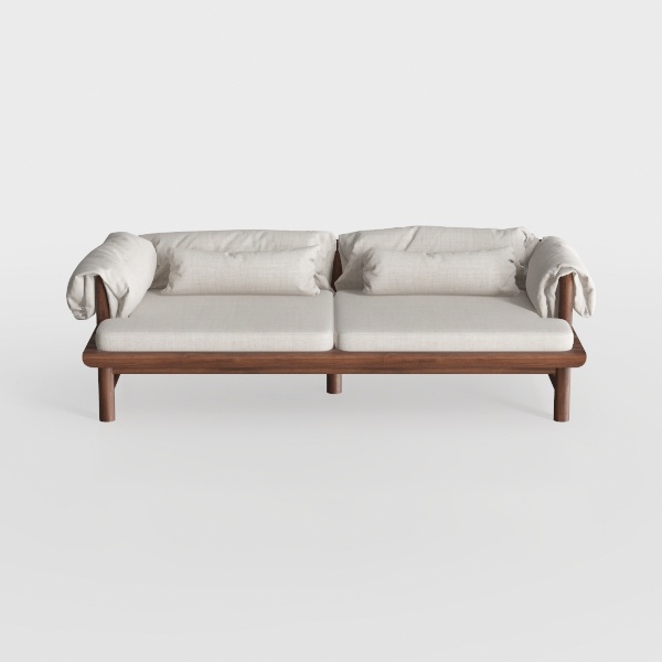 This sofa embodies a minimalist design philosophy, drawing inspiration from the serene aesthetics of Scandinavian design and the "less is more" principle. Its soft, textured linen-like fabric in a warm off-white hue feels gentle to the touch, with a subtle drape that adds softness to the frame. The wooden base, with its smooth, natural wood grain in a rich, warm walnut tone, provides a grounded contrast to the light upholstery, creating a balanced visual harmony that feels both calm and inviting.