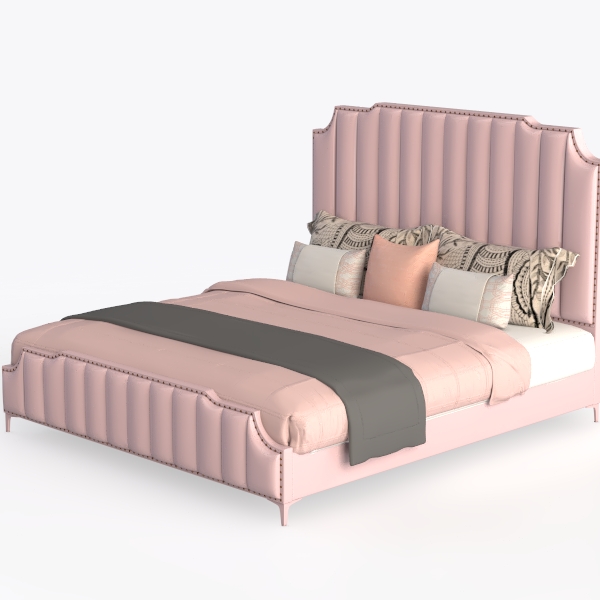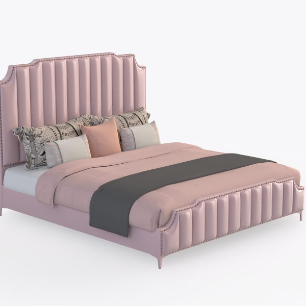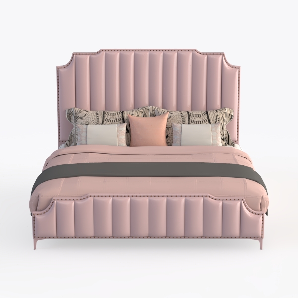 Crafted with soft pink upholstery, its vertical channeled headboard and nailhead trim evoke timeless elegance, blending vintage charm with modern comfort. The smooth, buttery texture of the fabric and structured lines create a warm, inviting vibe, perfect for a cozy retreat. Ideal for a master bedroom, it pairs beautifully with marble nightstands and gold pendant lights, enhancing a modern romantic or French country aesthetic. Ample headboard support and plush padding ensure exceptional comfort, making it a serene spot to unwind after a long day.