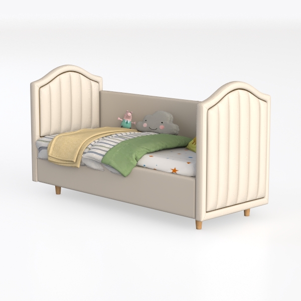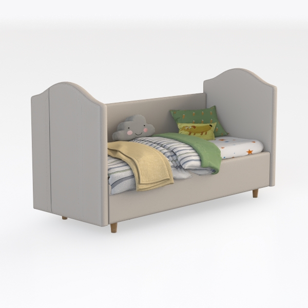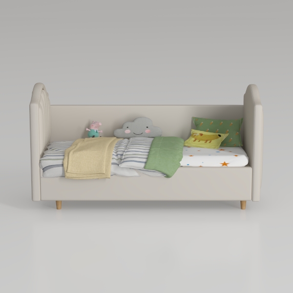 Inspired by playful fairy tales and soft natural elements, this kids' bed has a light gray frame with soft, textured fabric. Striped bedding and a cute cloud-shaped pillow create a warm vibe, while green and banana-patterned cushions add whimsy. Perfect for a child’s room, blending modern simplicity with charm, offering generous space for cozy sleep and playful moments.