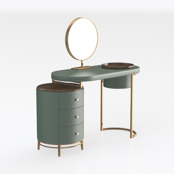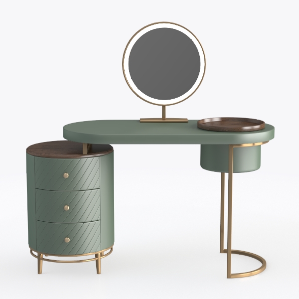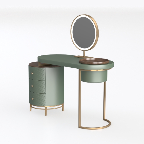 Crafted with mid-century modern charm, this vanity blends soft sage green with sleek gold metal legs. Textured diamond-quilted drawers add tactile interest, while the illuminated round mirror casts warm light. Ideal for a contemporary bedroom, pair it with marble accents and velvet cushions. Spacious storage and curved top offer both style and functionality.