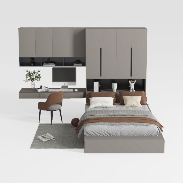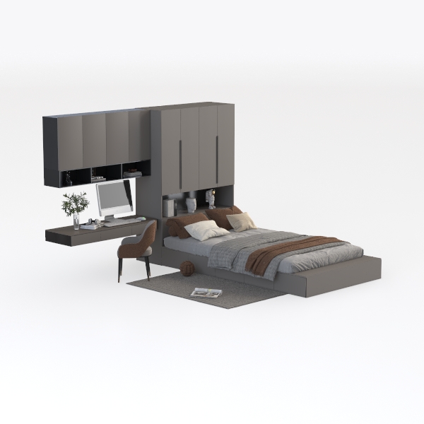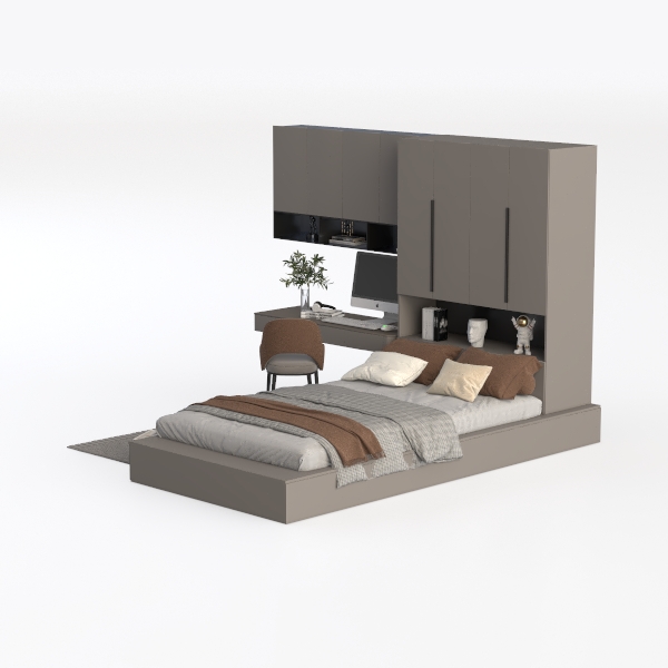 Blending sleek minimalism with compact functionality, this space draws inspiration from urban small-living needs. Smooth, matte surfaces in soft grays and warm browns create a calm, tactile feel, while clean lines enhance a clutter-free vibe. Ideal for modern studio apartments, it pairs seamlessly with metallic accents or glass decor to elevate the contemporary look. Ample built-in storage and a dual-purpose desk offer both sleep and work zones, balancing aesthetics and practicality.