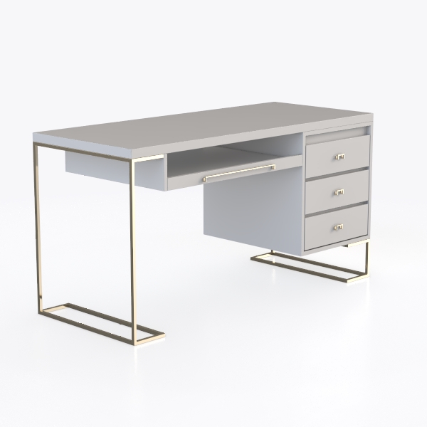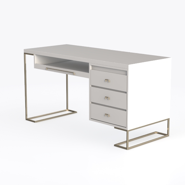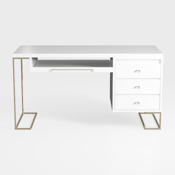Crafted with clean lines and geometric precision, this piece draws inspiration from mid-century modern minimalism. Its smooth white surface radiates crisp, airy charm, while matte gold metal legs add subtle warmth and stability, blending simplicity and luxury. Ideal for a modern study or minimalist vanity, it pairs beautifully with marble accents and soft lighting. Three drawers and an open shelf provide ample storage, balancing style and practicality.