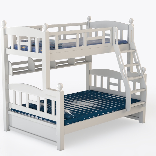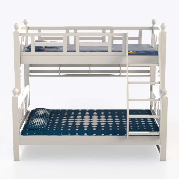 Designed with space-saving practicality and warm family charm, this white wooden bunk bed features a smooth frame and vibrant blue, dotted bedding. Its bright, playful aesthetic suits kid’s rooms or shared spaces, pairing well with minimalist or Scandinavian decor. Spacious for two sleepers, with sturdy rails and a safe ladder, ensuring comfort and security.