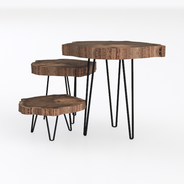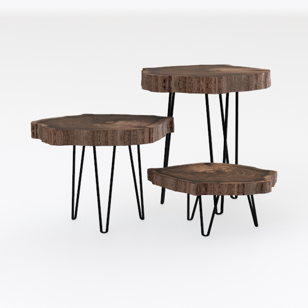 Inspired by nature's organic beauty, with table tops mimicking tree trunk cross-sections. Raw, textured wood grains and smooth metal legs create a warm, industrial contrast, with rich brown hues adding earthy charm. Perfect for bohemian or modern industrial living rooms, pairing beautifully with woven rugs and potted plants. Nesting design saves space, ideal for side tables or small coffee spots, offering both functionality and sculptural appeal.
