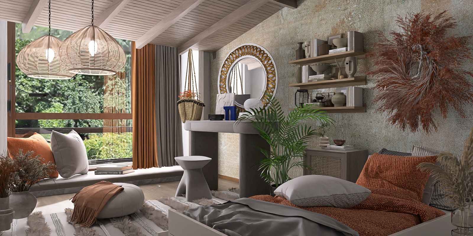 Inspired by minimalist Scandinavian design, this bed merges simplicity with functionality. Its smooth white frame, paired with a textured geometric bedspread and soft, plush pillows, creates a clean, airy look with subtle visual appeal. Perfect for a modern Scandinavian or contemporary bedroom, it pairs beautifully with wooden nightstands and linen curtains. Spacious drawers beneath offer ample storage, enhancing practicality without sacrificing style.