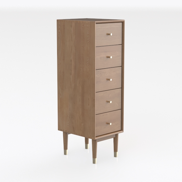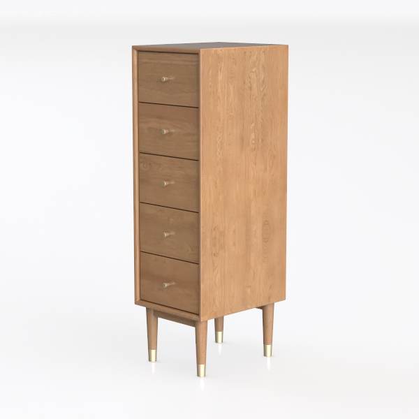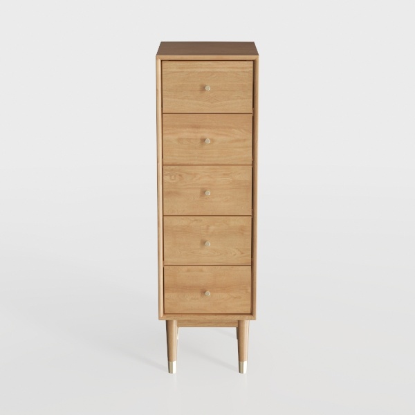 Inspired by Scandinavian minimalism and mid-century charm, this tall chest merges warm natural wood grains with sleek metal legs. Smooth, polished surfaces highlight the wood’s inherent texture, while slender, gold-accented legs add subtle elegance. Ideal for a cozy bedroom or entryway, it pairs beautifully with soft textiles and pendant lights to enhance a modern or retro-inspired space. Five deep drawers offer ample storage, with easy-glide hardware ensuring effortless use, blending practicality and aesthetic appeal.