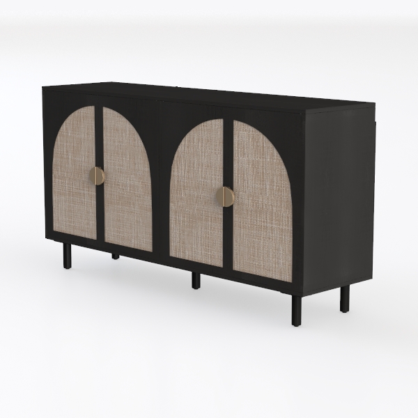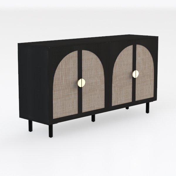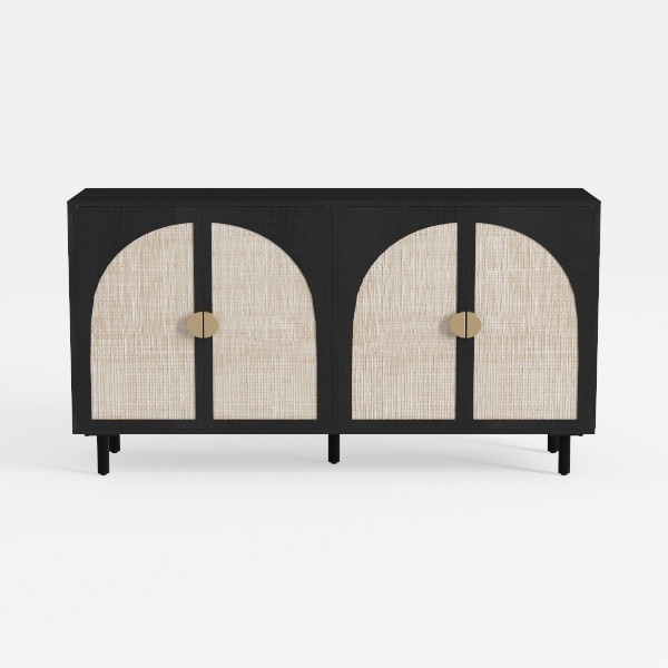 Draws inspiration from mid-century modern charm and natural textures, this cabinet features a smooth matte black frame and warm woven rattan panels. Curved arch doors create soft visual flow, while gold circular handles add subtle luxury. Spacious storage behind doors, slim black legs ensure light, airy feel—ideal for modern minimalist or bohemian-luxe living rooms, paired with marble side tables and potted ferns.