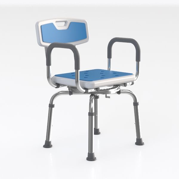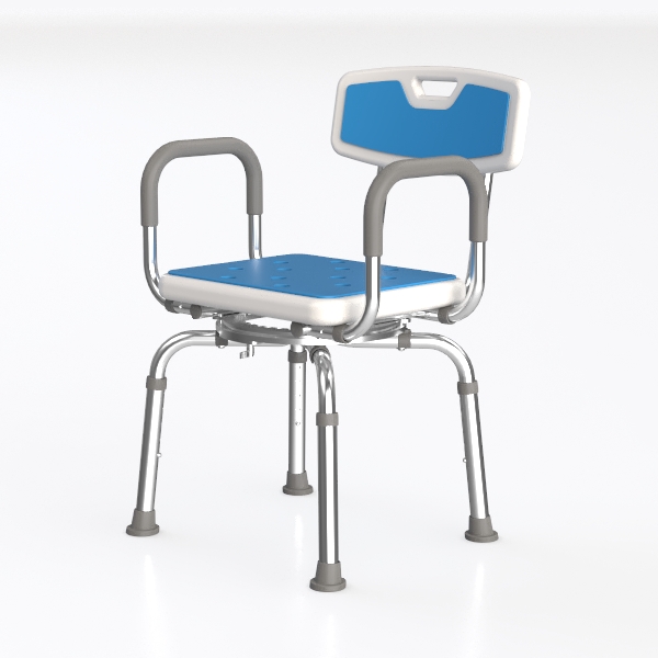 Designed for safety and comfort in wet spaces, this shower chair blends practicality with sleek style. The blue and white plastic seat/backrest offers a non-slip, cool touch, while the polished silver metal frame adds modern minimalism. Wide arms support easy standing, stable legs ensure secure bathing use, perfect for minimalist bathrooms.