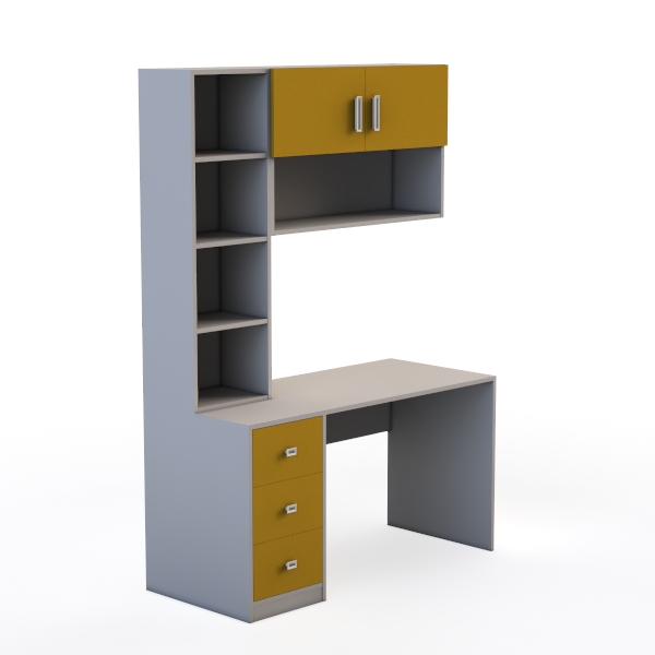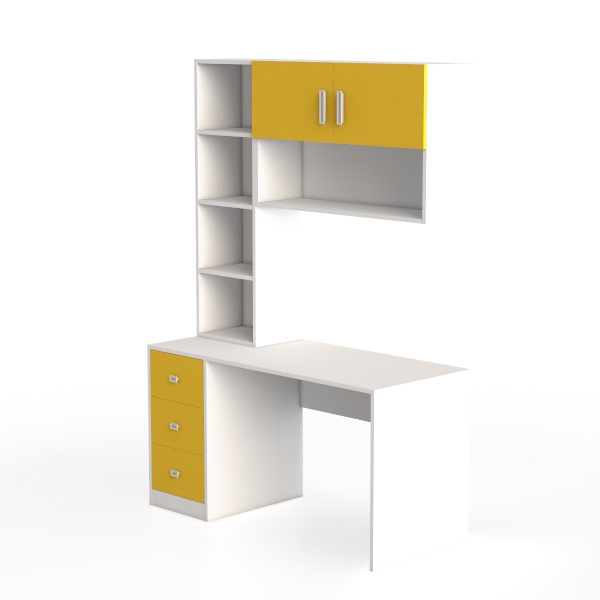 Designed for compact spaces, this functional unit blends minimalist aesthetics with practicality. Sleek, matte surfaces feel smooth to the touch, while the crisp white base contrasts vibrantly with warm yellow drawers and cabinets, creating a bright, airy look. Perfect for a modern studio or student dorm, it pairs beautifully with neutral-toned rugs and wooden accents, enhancing a Scandinavian or contemporary vibe. Ample drawers and a wall-mounted shelf offer organized storage, making it ideal for both work and study.