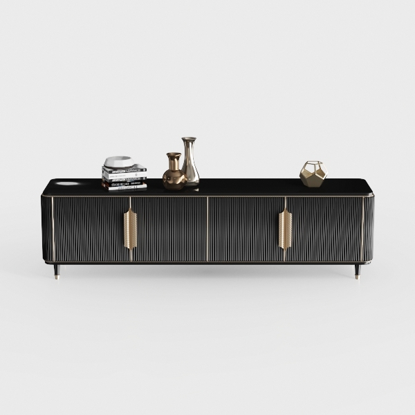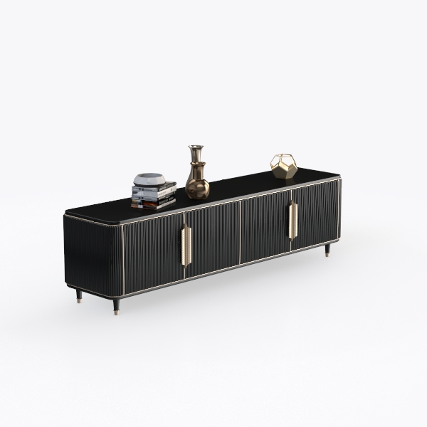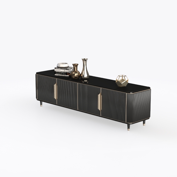 Inspired by mid-century modern design, this console blends geometric lines with soft metallic accents. Its sleek black surface, with vertical ribbed detailing, catches light gently, while gold handles add a touch of luxury. Ideal for a contemporary living room, pair it with marble coffee tables and brass lamps—soft-closing doors offer ample storage, keeping the space elegant and organized.