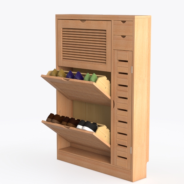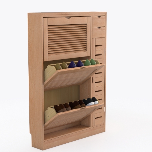 Inspired by natural simplicity, this wooden cabinet blends function with warm aesthetics. Smooth, light wood with visible grain delivers a tactile, earthy feel, enhancing room warmth. Perfect for minimalist/Scandinavian entryways, complementing linen rugs and ceramic accents. Spacious shelves and sliding compartments organize shoes; slatted doors add ventilation.