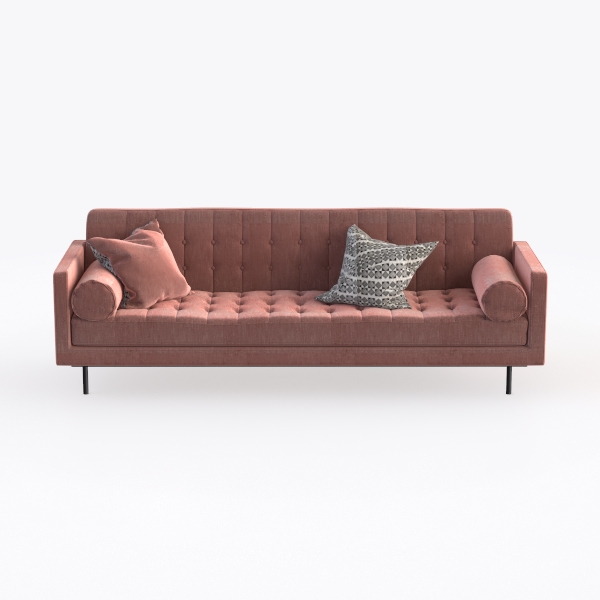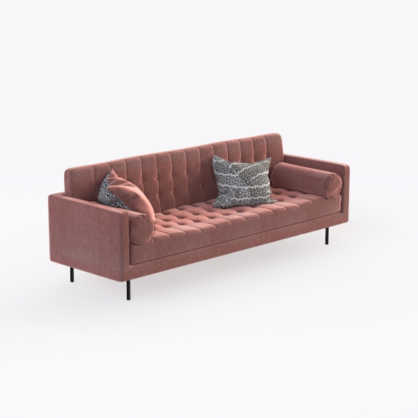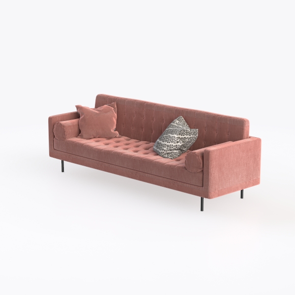 This sofa draws inspiration from mid-century modern design, blending classic details like tufted upholstery and rounded armrests with sleek, contemporary lines. Its soft blush-pink fabric, with a subtle velvet-like texture, feels warm and inviting to the touch—smooth yet slightly plush, catching light gently to add depth. The tufted pattern creates a rhythmic diamond texture across the back and seat, while the curved armrests soften the silhouette, paired with slender black legs that keep the piece feeling light and uncluttered.