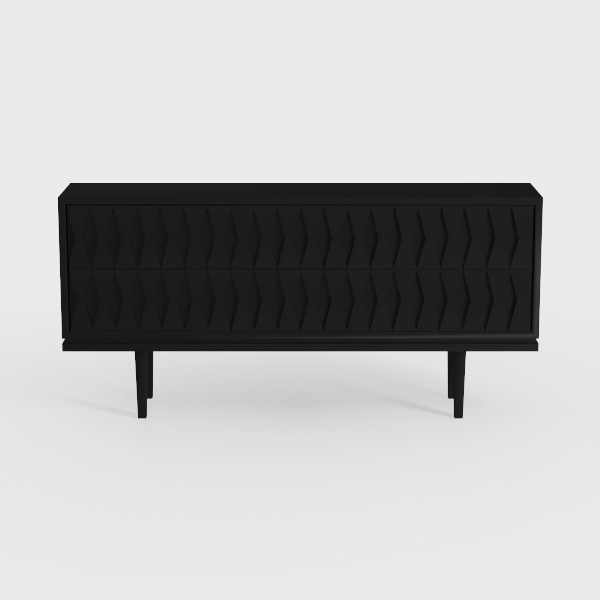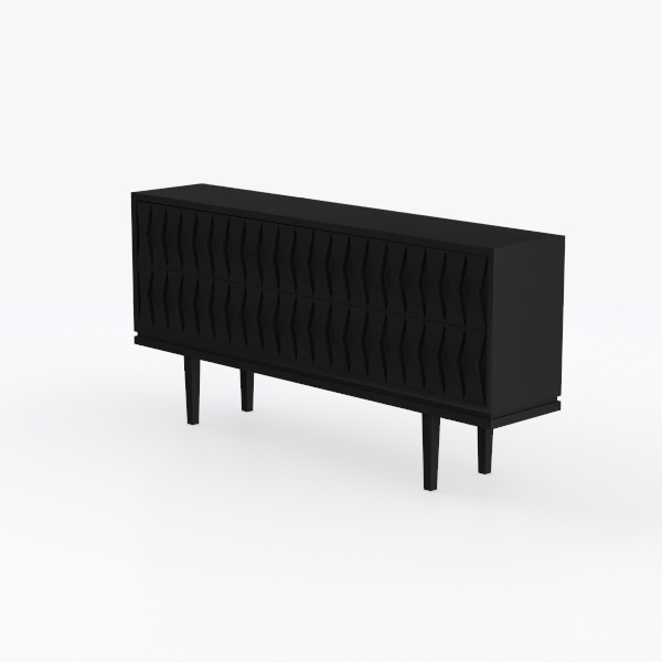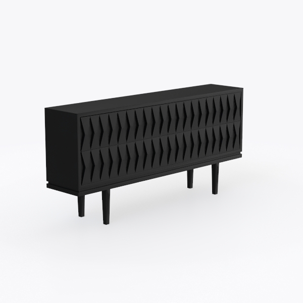 Inspired by bold geometric patterns from mid-century modern design, this black cabinet features a smooth matte surface with intricate zigzag textures, adding depth and subtle tactile interest. Its slender black legs create an airy silhouette, making it ideal for a modern minimalist living room or bedroom, pairing beautifully with neutral walls and metallic accents like brass lamps or marble side tables. Spacious drawers offer ample storage, blending style and practicality seamlessly.
