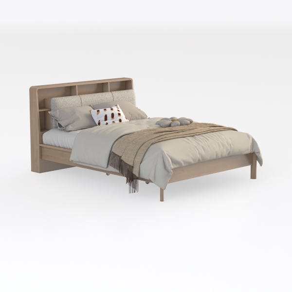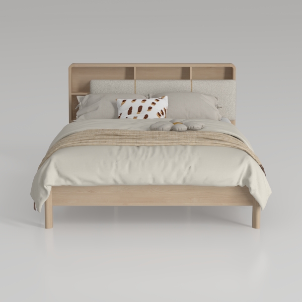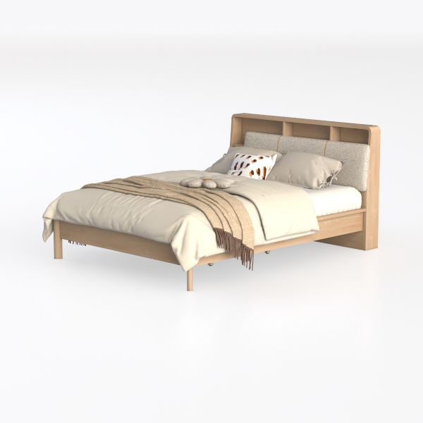 Inspired by natural serenity, this bed blends warm wood grain with a soft upholstered headboard. Clean lines and neutral tones create a calming vibe, ideal for a modern Scandinavian bedroom. Linen beddings and potted greenery enhance its tranquil look, with a sturdy frame ensuring stability and gentle back support.