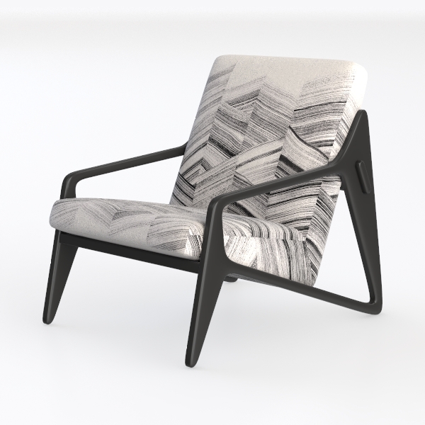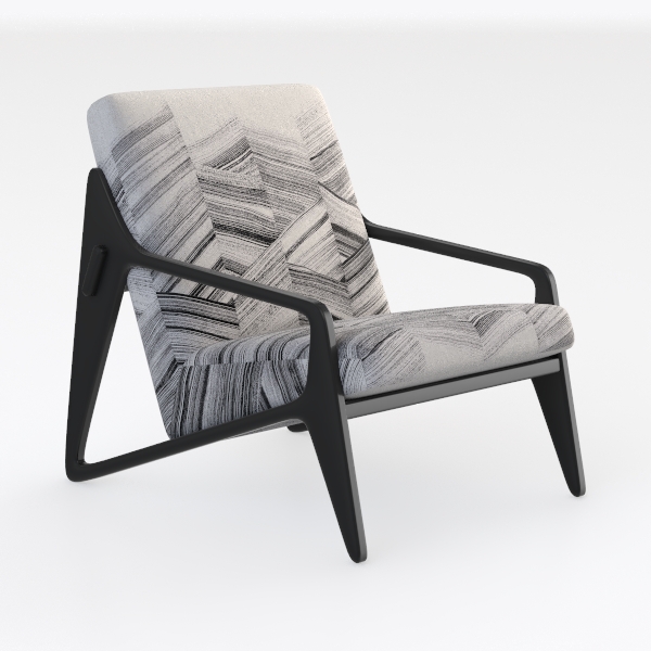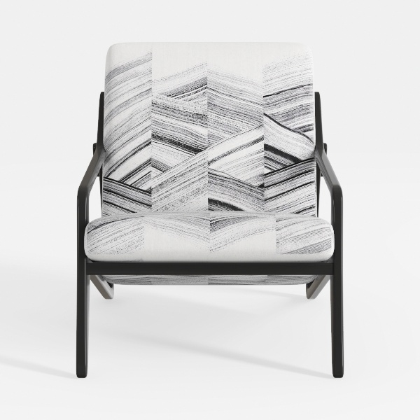 This armchair blends artistic vision with everyday comfort, taking cues from abstract expressionism to craft a design that feels both bold and refined. Its upholstery, a soft, textured blend, features a striking black-and-white geometric pattern—think dynamic brushstrokes or folded paper—where diagonal lines and chevron folds create a rhythmic, almost kinetic visual flow, drawing the eye across the surface. The frame, a sleek black, contrasts sharply with the light base, enhancing the chair’s modern silhouette; its angular arms and tapering legs add a touch of elegance, keeping the piece light and uncluttered.