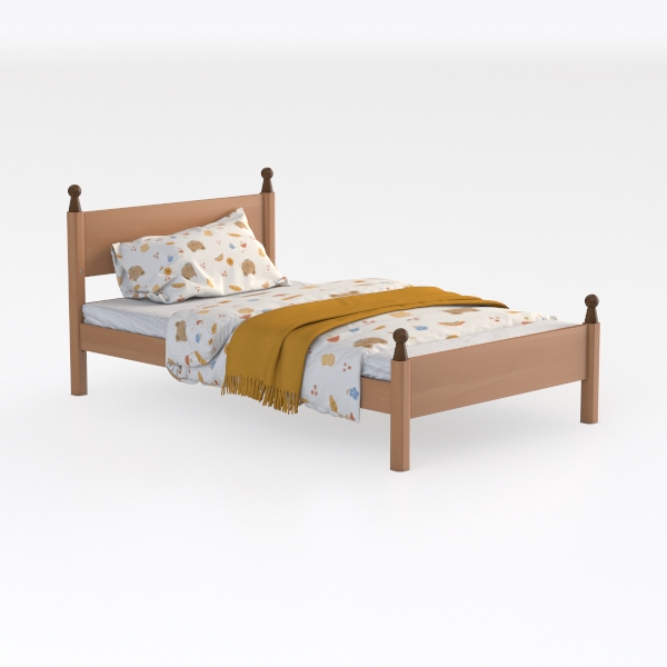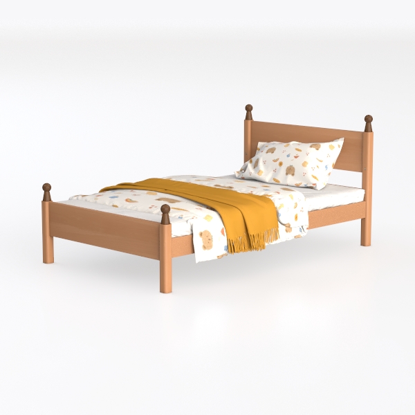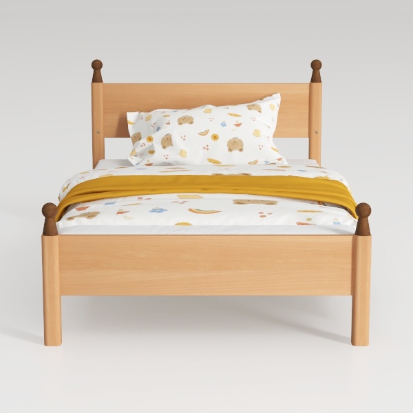 Inspired by warm childhood memories, this bed blends natural elements with playful charm. The light wood frame has a smooth, warm texture, while soft, colorful bedding with cute animal patterns adds lively energy. Perfect for a cozy kids' room, it pairs with wooden furniture and soft lighting, creating a safe, inviting space. Sturdy construction ensures stability, ideal for restful sleep.