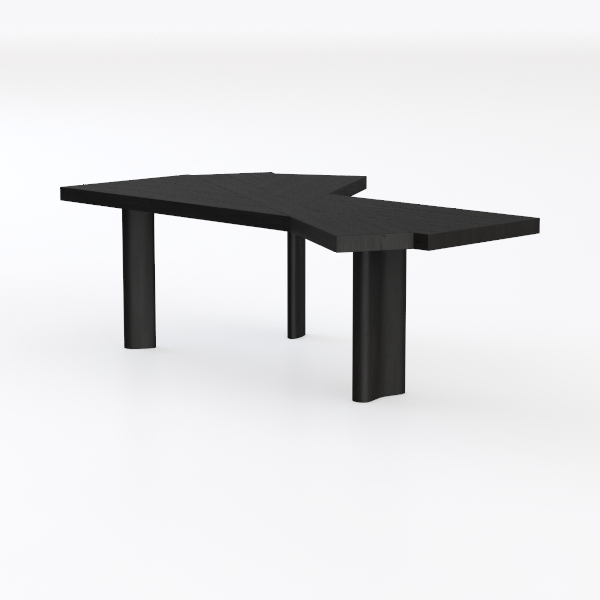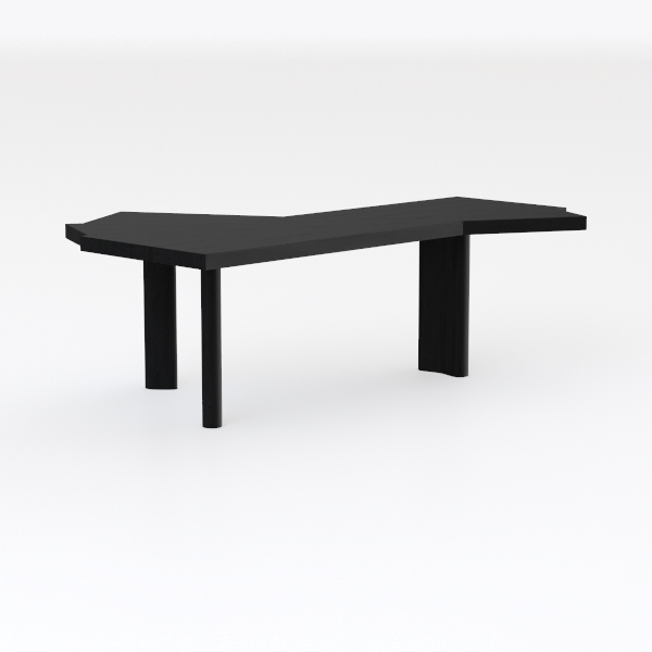 Inspired by organic rock formations, this piece blends natural ruggedness with minimalist precision. Its matte black surface, with subtle wood grain texture, offers a smooth yet warm touch. The irregular, angular tabletop and slender, tapering legs create a striking, sculptural presence. Ideal for modern, Scandinavian, or industrial spaces, it pairs beautifully with neutral sofas and potted plants, while a generous surface provides ample room for daily essentials or decor, with stable legs ensuring lasting durability.