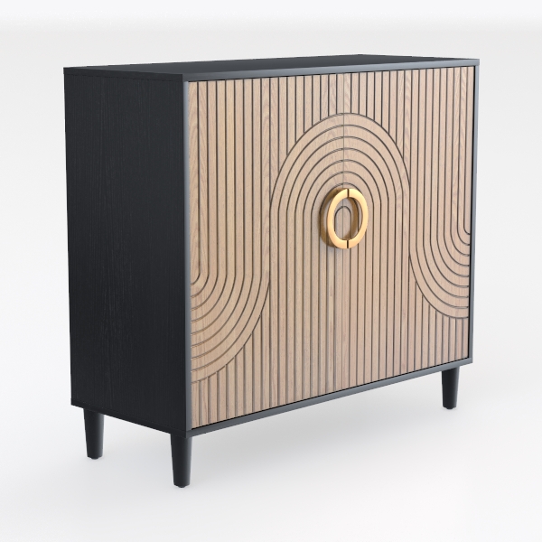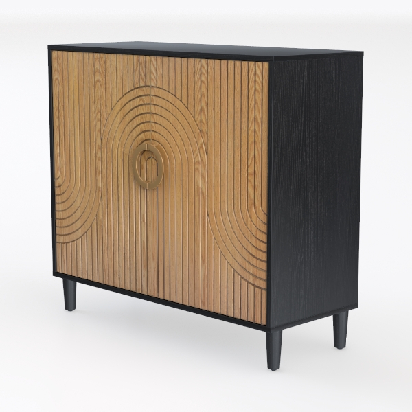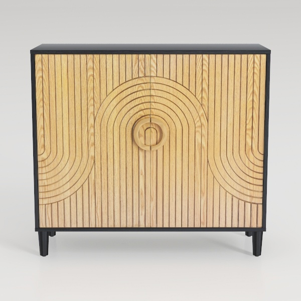 Inspired by organic architectural curves, this cabinet blends warm wood grains with sleek black accents. Its smooth, vertically ridged surface creates subtle depth, while curved arches add soft visual flow. Perfect for modern minimalist living or dining, pair with neutral sofas and greenery. Ample storage behind doors, sturdy black legs ensure stability.
