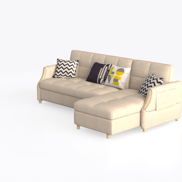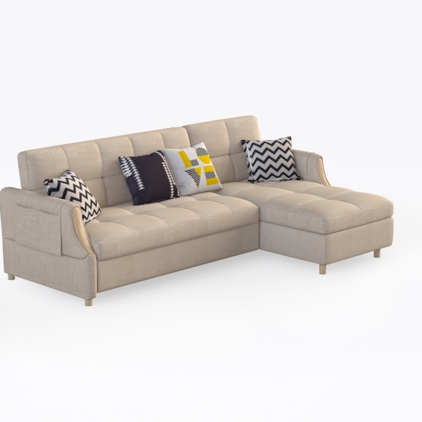 Crafted with a creamy, linen-like upholstery, the surface feels delightfully soft and inviting, while the gently textured fabric adds depth without overwhelming the eye. The warm wooden armrests, with their smooth, polished finish, bring a touch of nature’s warmth, creating a cozy contrast to the light, airy base. The L-shaped configuration, complete with a spacious chaise longue, not only maximizes seating area but also offers a relaxed, lounge-like feel, making it perfect for both quiet evenings and casual gatherings.