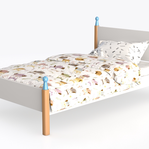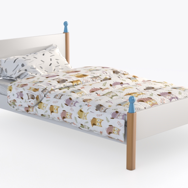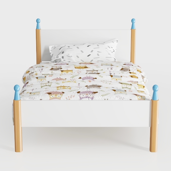 This bed, inspired by nature and playful forest themes, features warm natural wood tones and a soft, textured owl-patterned bedspread. Light, airy, and with blue-finished posts, it creates a cozy, inviting vibe, perfect for a whimsical kids' room paired with soft fairy lights and pastel decor. Sturdy wooden frame ensures stability, while the snug fit makes bedtime feel like a gentle, comforting retreat.
