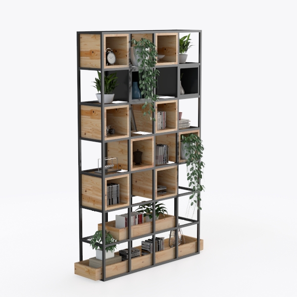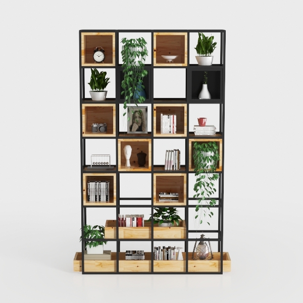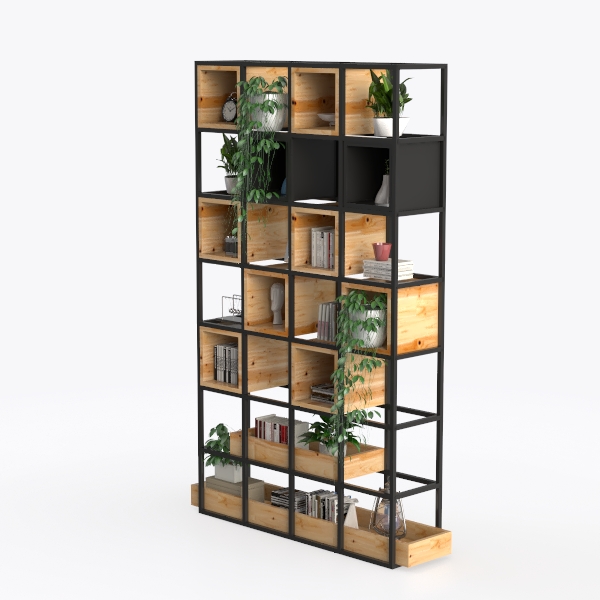 Blending natural warmth with industrial edge, this multi-compartment shelf features rustic wooden cubes and sleek black metal frames. Warm wood grains and cool metal lines contrast beautifully, while lush greenery spilling from compartments adds vibrant life. Ideal for modern minimalist or Scandinavian spaces, it serves as a functional room divider, organizing books, decor, and plants neatly, balancing practicality with style.