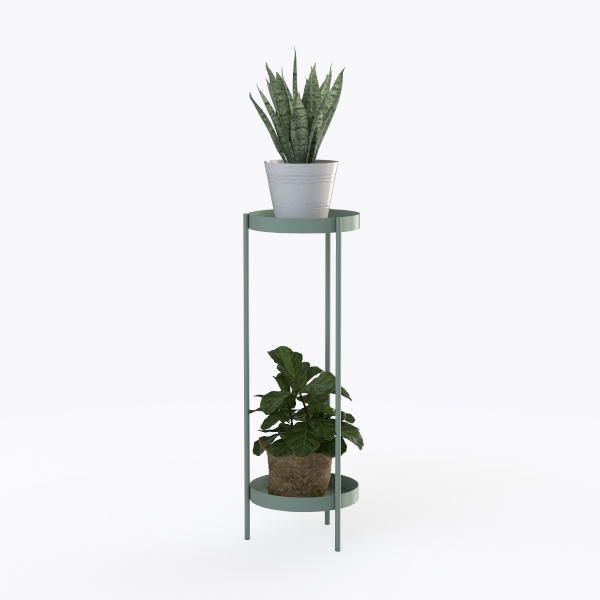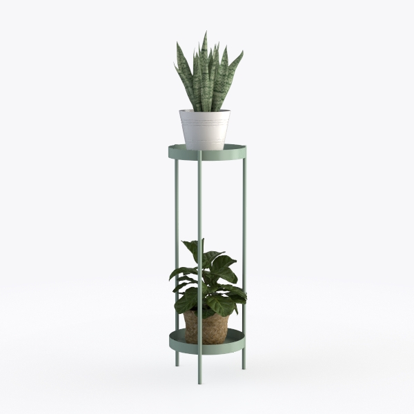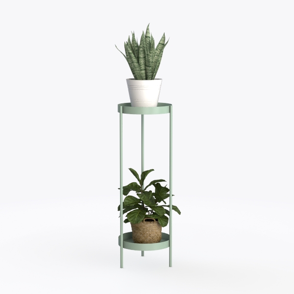 Crafted with nature-inspired minimalism, this elegant plant stand features a sleek, light green metal frame with smooth surfaces. Its two-tier design holds two lush plants—one in a white ceramic pot, the other in a woven basket—creating a fresh, airy vibe. Perfect for modern, Scandinavian-style living rooms or balconies, it pairs beautifully with wooden side tables or glass coffee tables, blending functionality and natural charm.