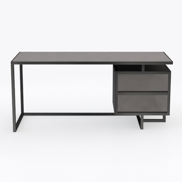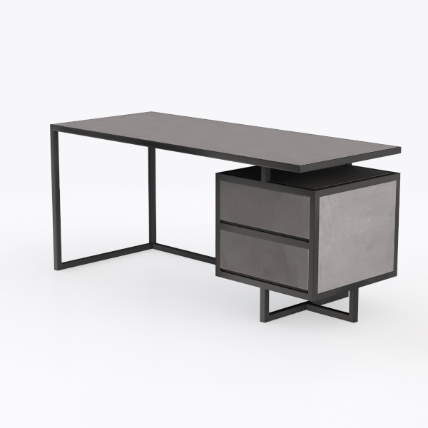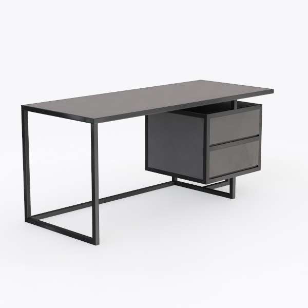 Inspired by minimalist architecture, this home desk blends sleek aesthetics with practicality. Its smooth matte gray surface and angular black metal frame create a cool, tactile contrast, catching light subtly. Perfect for modern home offices or living rooms, it pairs beautifully with warm wood and soft ambient lighting. Spacious top and two deep drawers offer ample storage, balancing style and functionality seamlessly.
