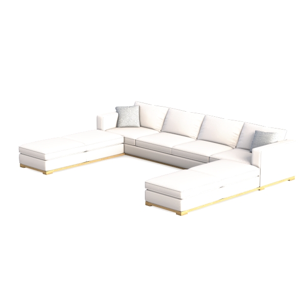 The upholstery, a soft, textured fabric in crisp white, invites tactile comfort; its subtle weave catches light gently, creating a warm, airy feel that opens up the room. The L-shape silhouette, with rounded armrests and a low-profile design, softens the space, while slim, gold-toned legs add a touch of understated luxury, balancing the sofa’s minimalist aesthetic.