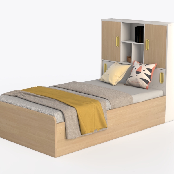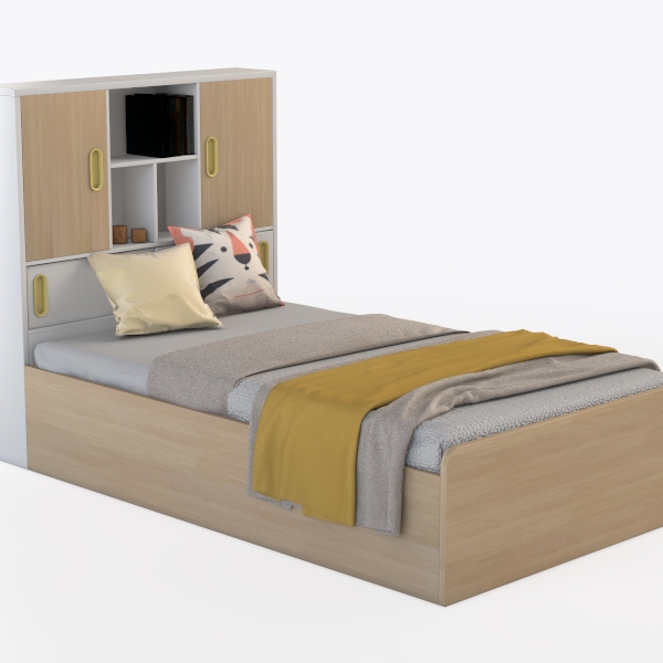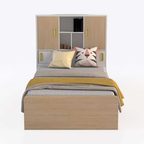 Inspired by balancing style and space, this bed blends warm wood grain with crisp white accents, golden handles adding subtle elegance. Soft, layered linens and a tiger-patterned pillow enhance coziness, while built-in storage above the headboard offers practicality. Ideal for a modern kids' room or compact bedroom, merging minimalism with playful charm seamlessly.