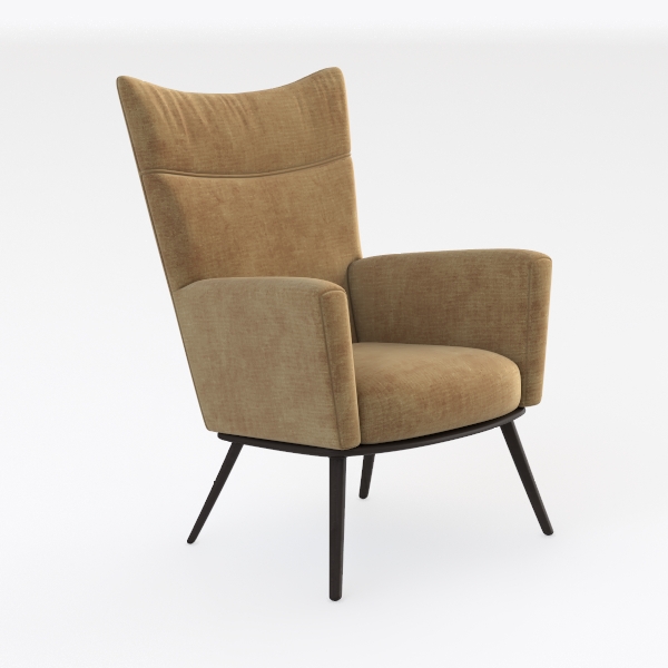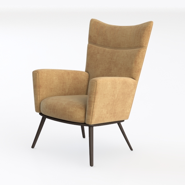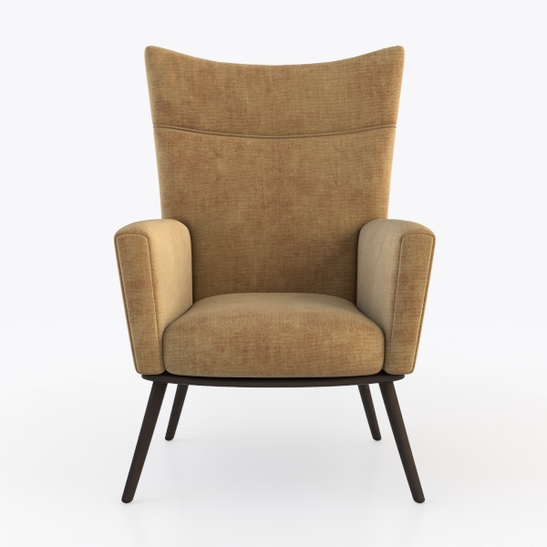 This armchair serves as a warm, inviting centerpiece in any interior, blending classic design cues with modern comfort. Its inspiration draws from mid-century modern furniture, where organic curves meet minimalist precision—evident in the gently sloped high back, which mimics the soft arc of a leaf, and the rounded armrests, designed for relaxed support. The upholstery, a textured fabric in a rich camel hue, feels delightfully tactile: smooth to the touch yet with subtle weave patterns that catch light softly, creating a warm, earthy glow. Dark, slender wooden legs add stability while keeping the piece airy, making it feel both grounded and open in smaller spaces.
