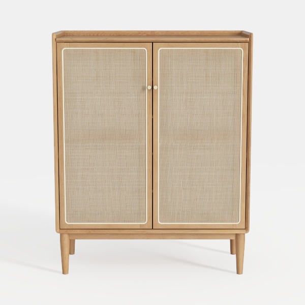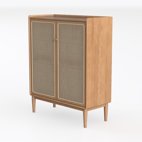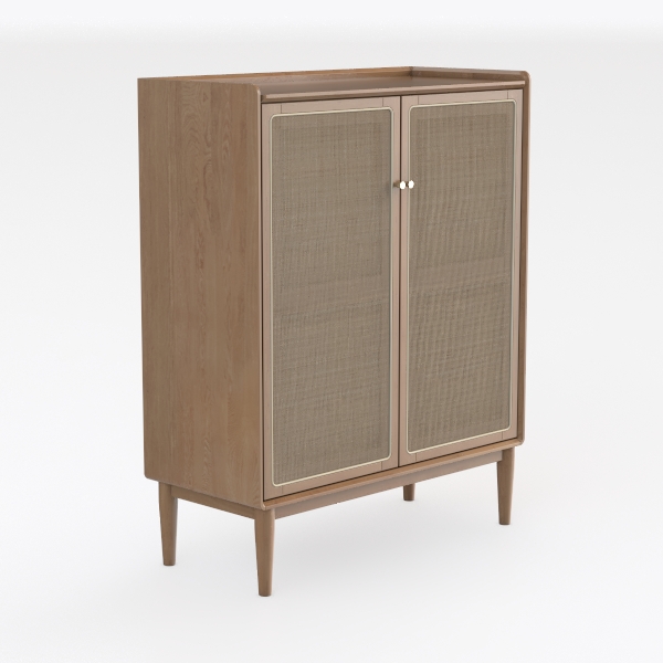 Inspired by Scandinavian minimalism and natural textures, this cabinet features a warm oak frame with smooth surfaces and delicate woven doors, creating a soft yet structured look. It’s ideal for modern, Japanese, or coastal living rooms, complementing marble surfaces and potted greenery. Spacious interior offers hidden storage, while slender legs add lightness, making it both functional and visually airy.