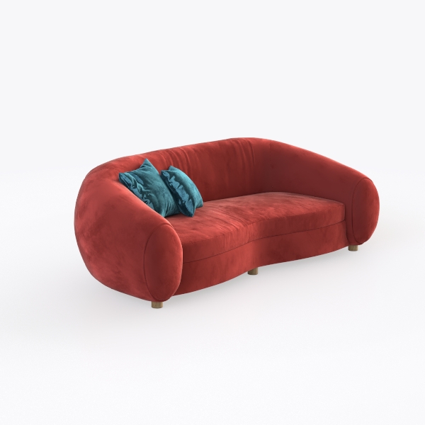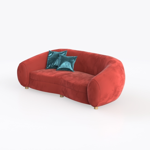 Drawing inspiration from organic, flowing forms—think smooth seashells or soft cloud contours—the sofa’s gentle, curved silhouette feels both timeless and contemporary, evoking a sense of calm and warmth. The rich, deep red upholstery, crafted from plush velvet, invites touch with its velvety softness and subtle sheen, catching light to create a warm, inviting glow. Its rounded armrests and low, wide profile wrap around the body, balancing bold color with a surprisingly approachable presence, while slim wooden legs keep the design light and airy, elevating the piece from the floor.