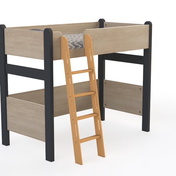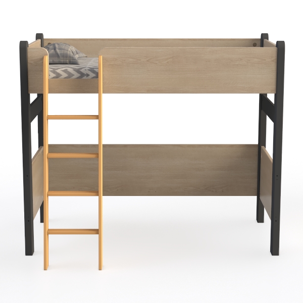 Designed for family living, it blends practicality with warm aesthetics, drawing inspiration from cozy, space-efficient childhood bedrooms. Light oak wood surfaces feel smooth to the touch, complemented by sleek black metal accents that add a modern edge, creating a balanced, inviting look. Perfect for a kid’s room or small family space, it pairs well with soft textiles like knit throws and colorful wall art, enhancing a playful yet tidy vibe. The sturdy wooden ladder and lower shelf offer easy access and extra storage, making it both functional and stylish for everyday use.